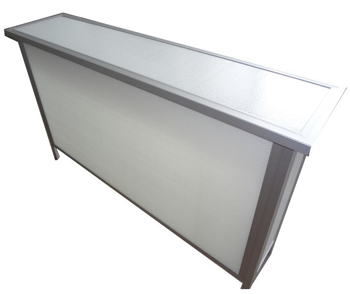 Ultraleichter Tresen aus extrem festem Wabenverbundstoff. Wasser und UV beständig. 100% Outdoor geeignet. Ideal für Märkte, Messen, Gastro und Cocktailbars. Der Rahmen besteht aus edlen eloxierten Aluminiumprofilen. Die beiden Seitenteile sind mittels Scharnieren an der Frontplatte befestigt. Magnete verhindern das Aufklappen der Seitenteile beim Transport. Die Arbeitsplatte wird aufgesteckt. Montage werkzeugfrei und von einer Person zu bewerkstelligen.